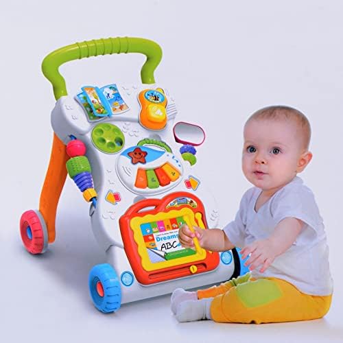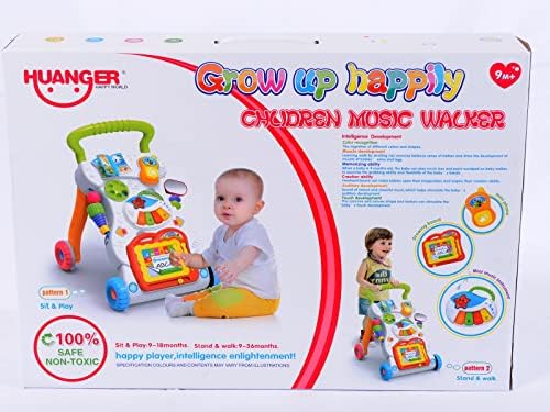 2 In 1 First Steps Baby Walker Sounds and Lights Fun Push Along WalkerWith textured wheels, an easy grip handle, and a durable design, the sturdy walker gives all the support they need to take their first steps. The fun-filled activity panel can also be removed from the walker for extra sit-down play. With lots of exciting activities, cheerful music, and friendly phrases, little ones will be introduced to numbers, shapes, animals, and colours. 2 In 1 Multi Functional Baby Musical Play & Push Walker AGE: 9 Months + Function 1 :Play Station: Sit on the floor and play Function 2: Push Walker