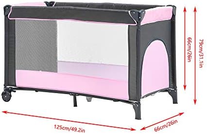Baby Baby Crib with Mattress 125x66cm, Folding Travel Cot and Playpen (Birth to 3Y), Portable Infant Nursery Center Playard with Wheels, Carrying Bag, Toddler Travel Bed, Blackish Blue-Pink