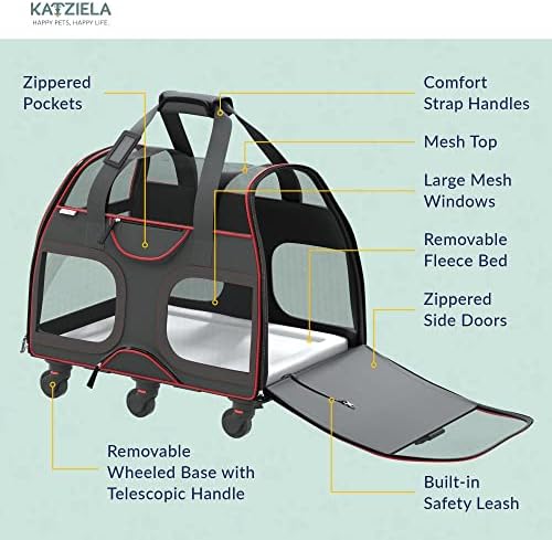 Katziela Rolling Pet Carrier – Airline Approved Dog Carrier with Removable Wheels – TSA Approved Pet Carrier for Small Dogs and Cats – Soft FAA Travel Airplane Dog Carrier Underseat Wheeled Luggage