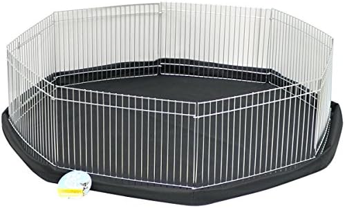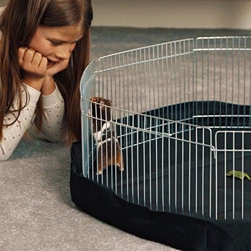 Me & My Pet Mini Playpen & Floor Mat – Ideal for rabbits, guinea pigs, hamsters & other small pets. Gives your pet a safe space to play when not in their cage – Small hinged door with latch allows you to release pet without lifting over. Suitable for both indoor & outdoor use – Octagonal/8 panel shape – Please note: pets may jump over playpen if left unattended, we recommend ensuring your pet is supervised at all times. Easily folds flat for storage & transportation – Simply hook end panels together to assemble – Black water resistant mat protects your floor from any mess & scratches as well as preventing pets from burrowing under the playpen. Dimensions – Playpen height: 23cm/panel width: 33cm/bar gaps: 1.5cm/door: 14x17cm/total mat width: 83.5cm