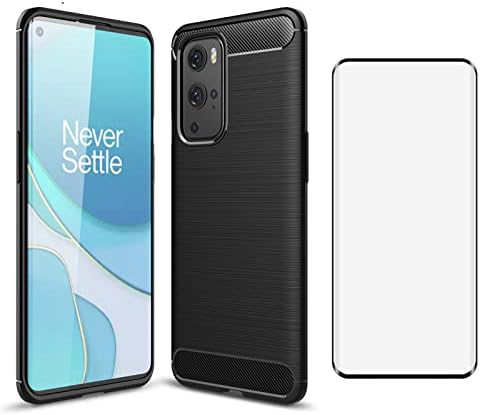 Phone Case for OnePlus 9 Pro One Plus 9Pro 5G and Tempered Glass Screen Protector with Cell Accessories Shockproof Soft Slim Silicone Thin Carbon Fiber On 1Plus 1 + Plus9 1+ Pro Nine Women Men Black