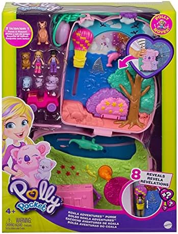 Includes Polly Pocket Koala Adventures purse compact, micro Polly doll and friend doll, 5 animals and removable vehicle accessory.