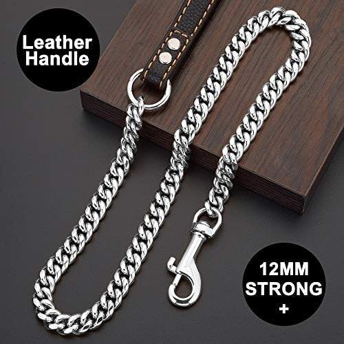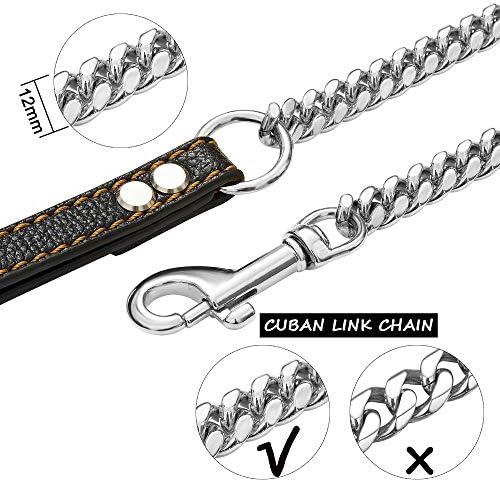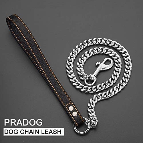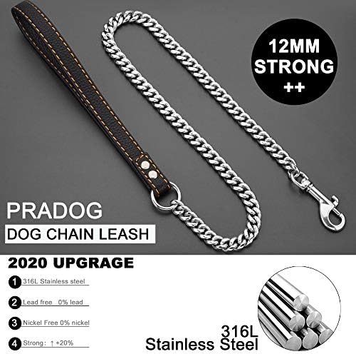 PRADOG Chain Dog Leash Metal Chew Proof 12MM Heavy Duty Pet Leash Chain with Leather Padded Handle for Large Medium Small Dogs(Totally Length of 4ft)