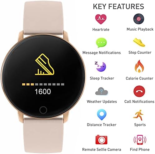 Reflex Active – The smartest smart watch! Introducing Reflex Active Series 5 smart watch with heart rate monitor, music control, colour touch screen and upto 7 day battery life. Features include: touch the screen to swap dial designs, receive call and message notifications, track specific activities (running/walking/cycling/climbing) in real time, distance/steps/calorie tracking, live weather updates from your watch, selfie camera control, find your phone function, track your sleep, alarm and reminders. Round rose gold case with nude pink silicone strap. Each watch is packed in a Reflex Active presentation gift box complete with instruction manual, USB charger (sealed rechargeable battery) and 2 year manufacturer guarantee. Splashproof only. Download the free Reflex Active App now to explore in more detail. IOS & Android Compatible.