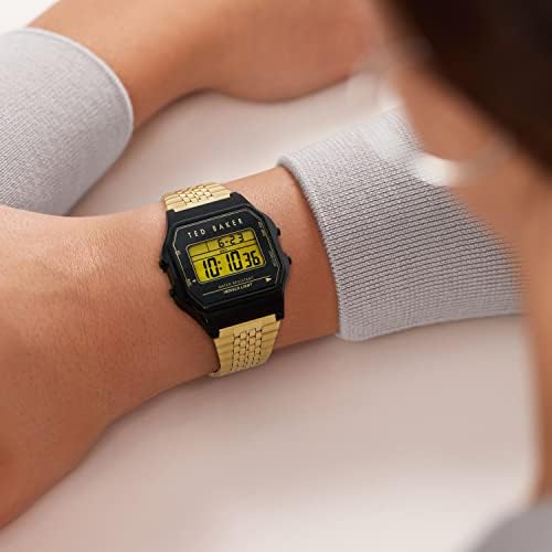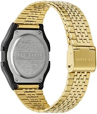 Step out in style wearing the classic design Ted Baker 35.5 mm Ted 80s watch. Gold metal construction. T pattern on the dial. Water resistant up to 30 meters. Case material: resin. Display type: digital. Quartz movement. Box included. Fold-over hook clasp. Measurements:Case Height: 25 9/10 mm.Case Width: 28 mm.Case Depth: 10 mm.Band Width: 14 7/10 mm.Band Circumference/Length: 7 3/4 in.Weight: 1.86 oz.
